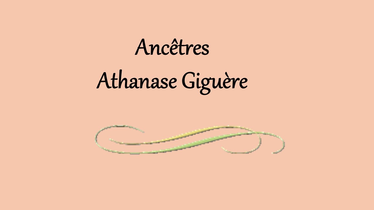 Louis Giguère (arrière-grand-père d’Athanase). Il est né le 9 avril 1768 à St-Anne-de-Beaupré. Il s’est marié le 16 février 1795, à l’âge de vingt-six ans, avec Josette Doyon, âgée de trente ans. Elle est née le 19 octobre 1764 à st-joseph-de-Beauce. Louis et Josette ont divorcé. Josette est décédée le 21 juillet 1800, à l’âge de 35 ans, à st-joseph-de-Beauce. Ensuite, Louis s’est remarié le 13 octobre 1801, à l’âge de 33 ans, avec Marie-Geneviève Jacques (arrière-grand-mère d’Athanase), âgée de dix-neuf ans, fille d’Augustin Jacques et Marie Veronique Marcoux. Marie-Geneviève est née le 29 janvier 1782 à St-Joseph-de-Beauce (Québec), Canada. Elle est décédée le 2 janvier 1869, à l’âge de 86 ans, à St-Joseph-de-Beauce (Québec), Canada. Il est décédé le 25 mars 1852, à l’âge de 83 ans, à St-Joseph-de-Beauce. Il a été inhumé le 27 mars 1852 à Saint-Joseph-de-Beauce, Beauce (Québec), Canada.